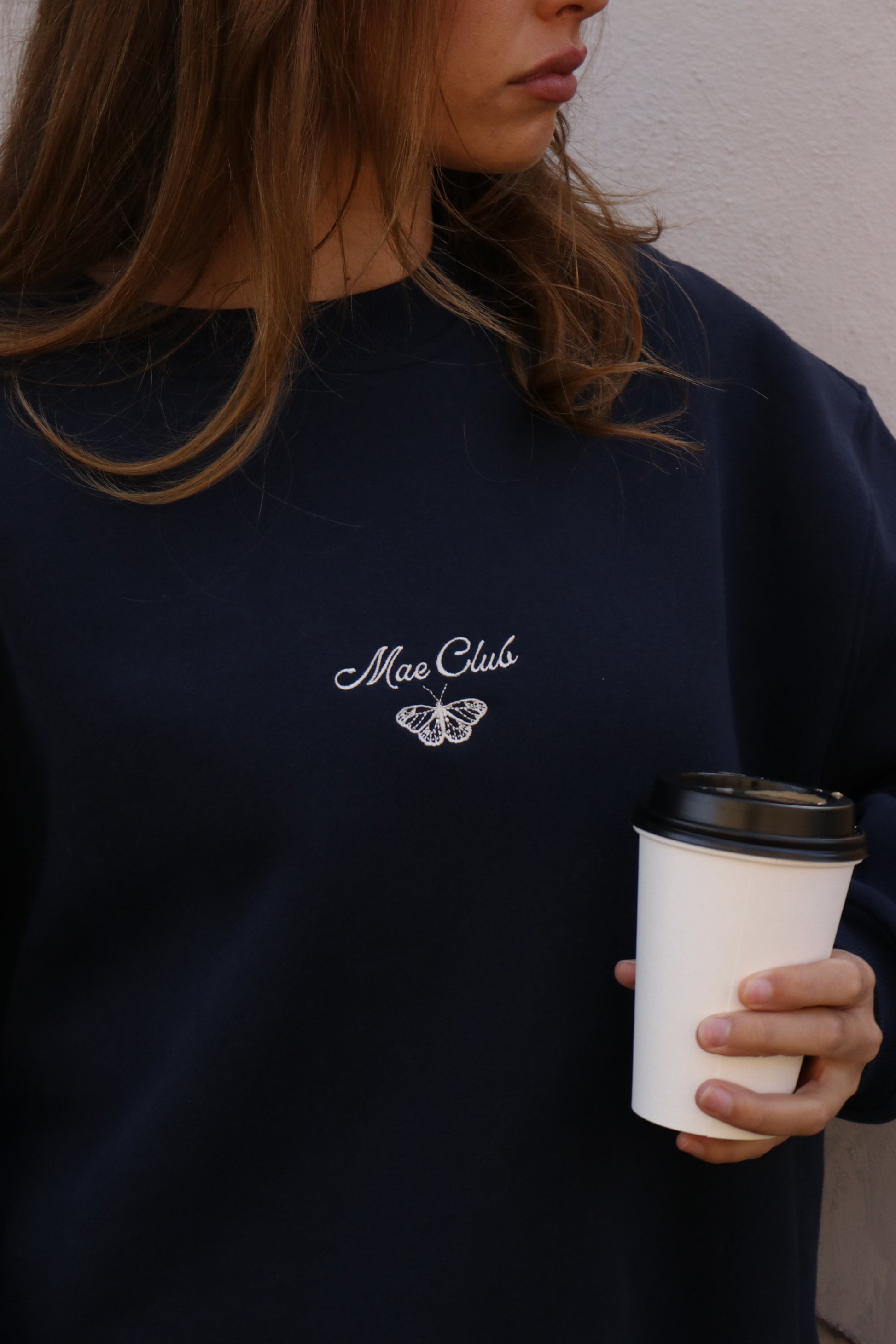 Our Butterfly Embroidered Sweatshirt is a unisex, oversized fitting crew neck. Featuring super-soft fleece that keeps you warm as well as our custom Mae club and Butterfly embroidered artwork on the front and sleeve.