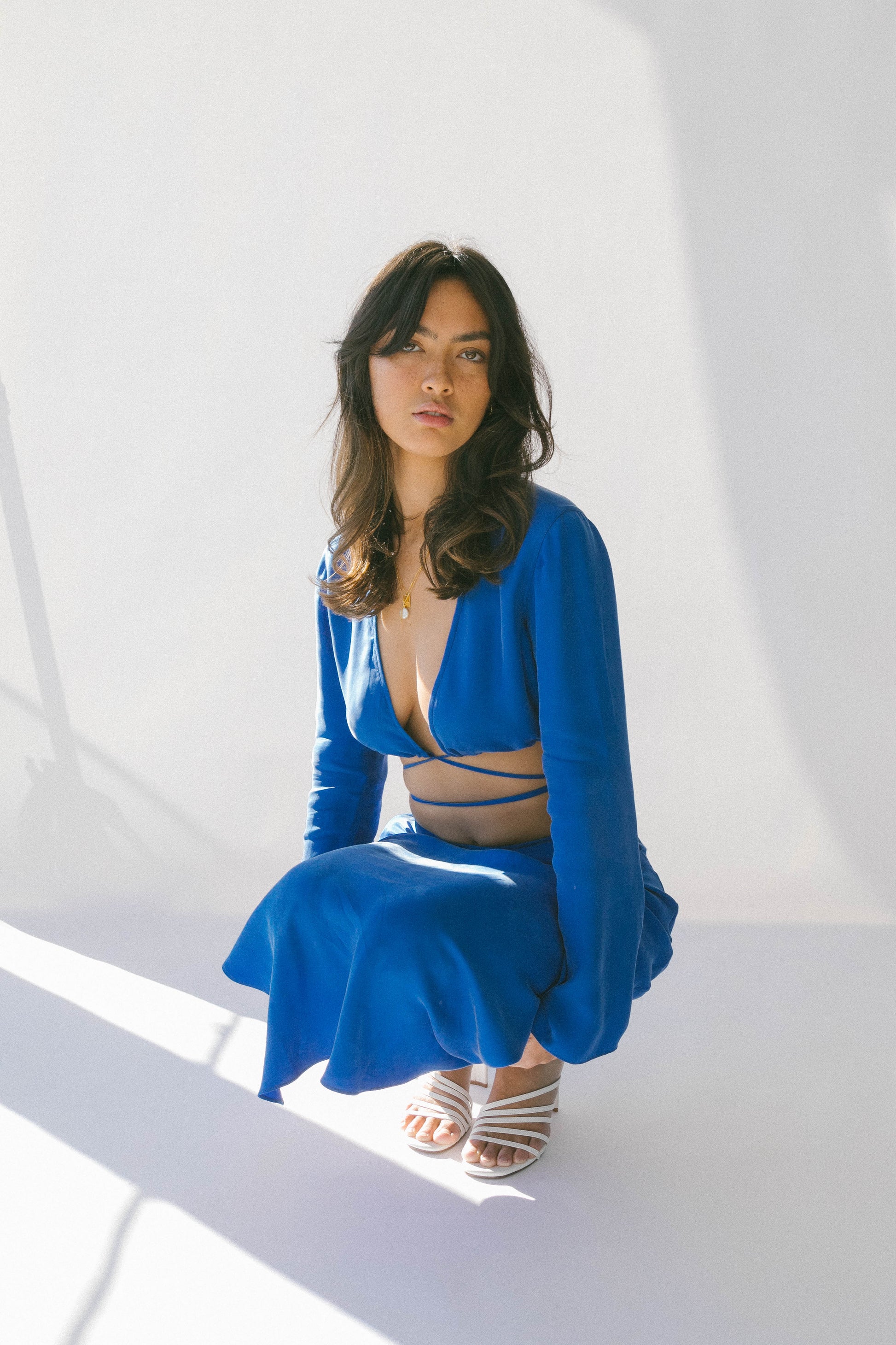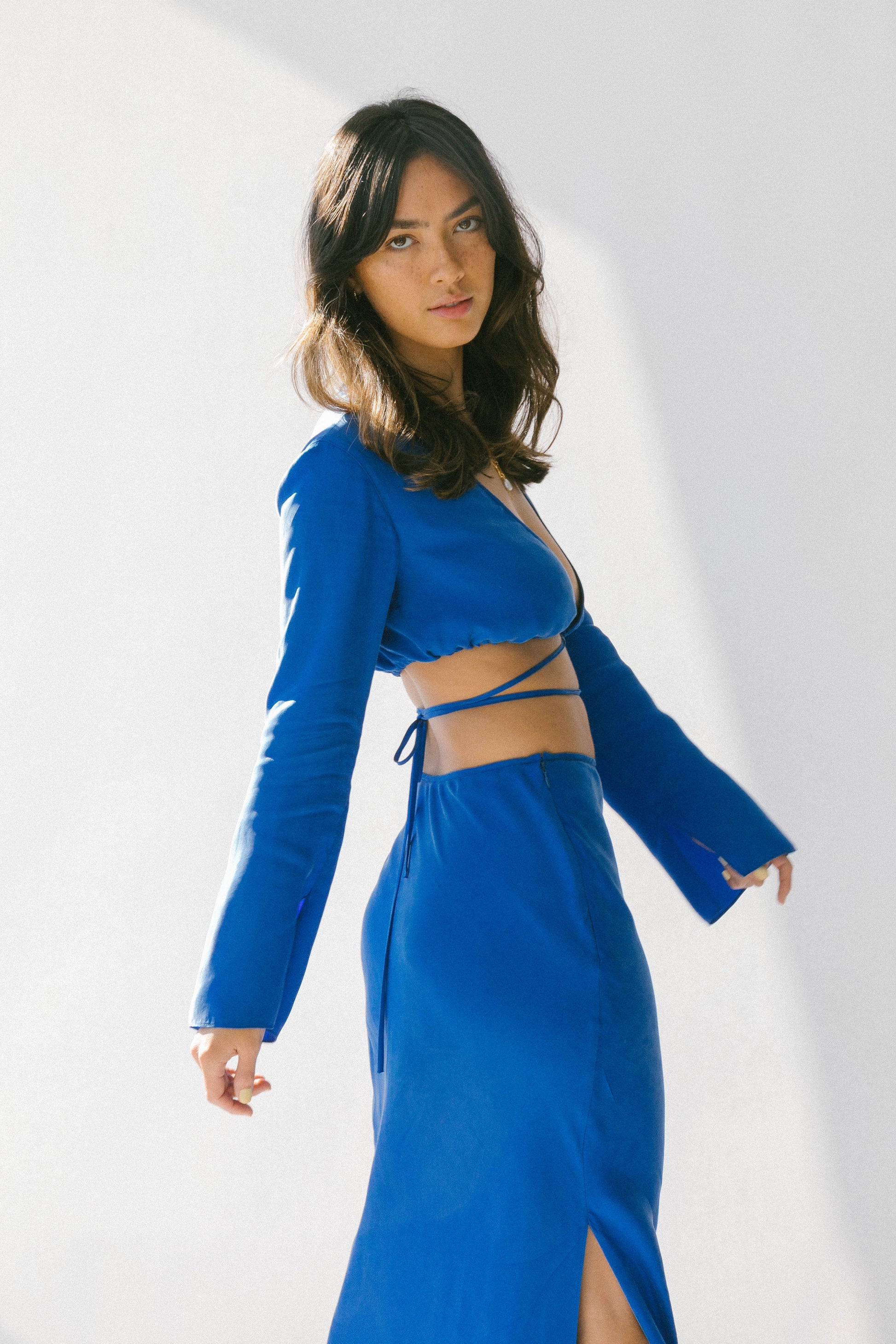 Our Esti Wrap Top is a relaxed crop with a waist wrap detail that can be tied at the front or back, the open front has bias detailing and can be adjusted for more or less coverage, the sleeves are slightly flared and have a delicate slit detail. Pair back with the Giorgia Skirt for a matching set.