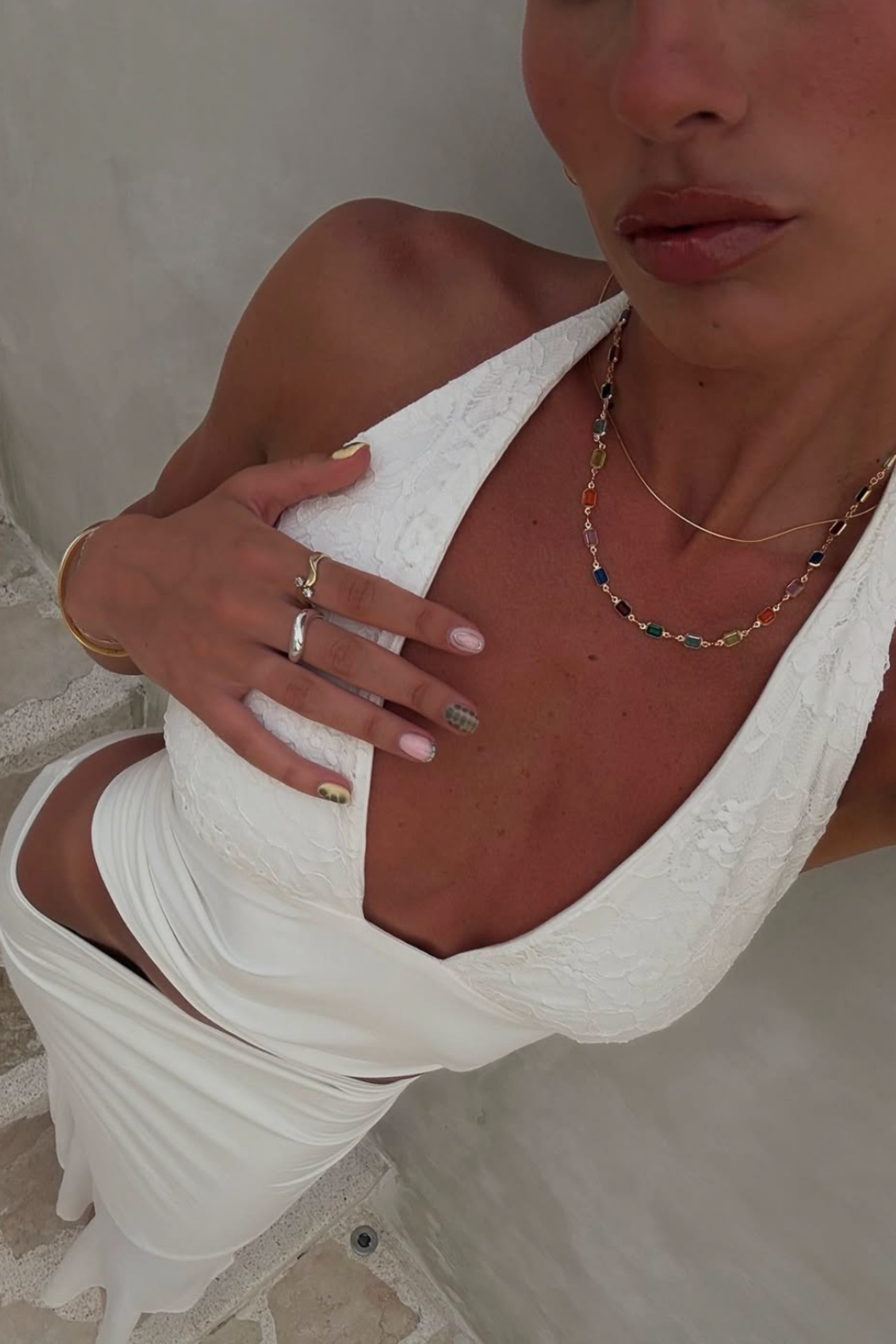 Our Lola Lace Top in Ivory is a double lined halter style bodice cut from soft bamboo spandex, featuring floral lace on the bust, adjustable gathering at the back that allows you to synch in the waist, as well as delicate cream satin ties on both the neck and back.